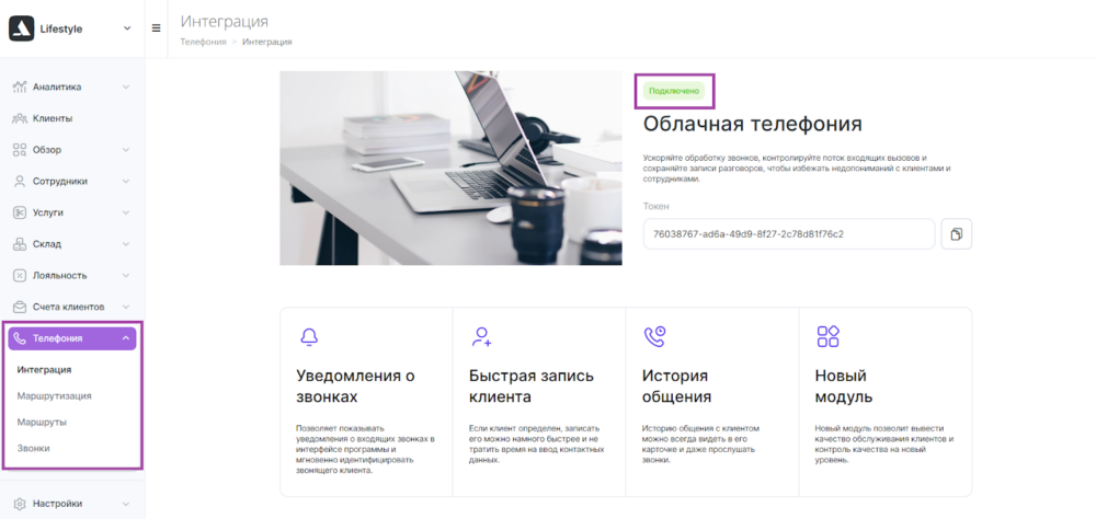 - В личном кабинете Altegio зайдите в раздел Телефония и скопируйте токен.