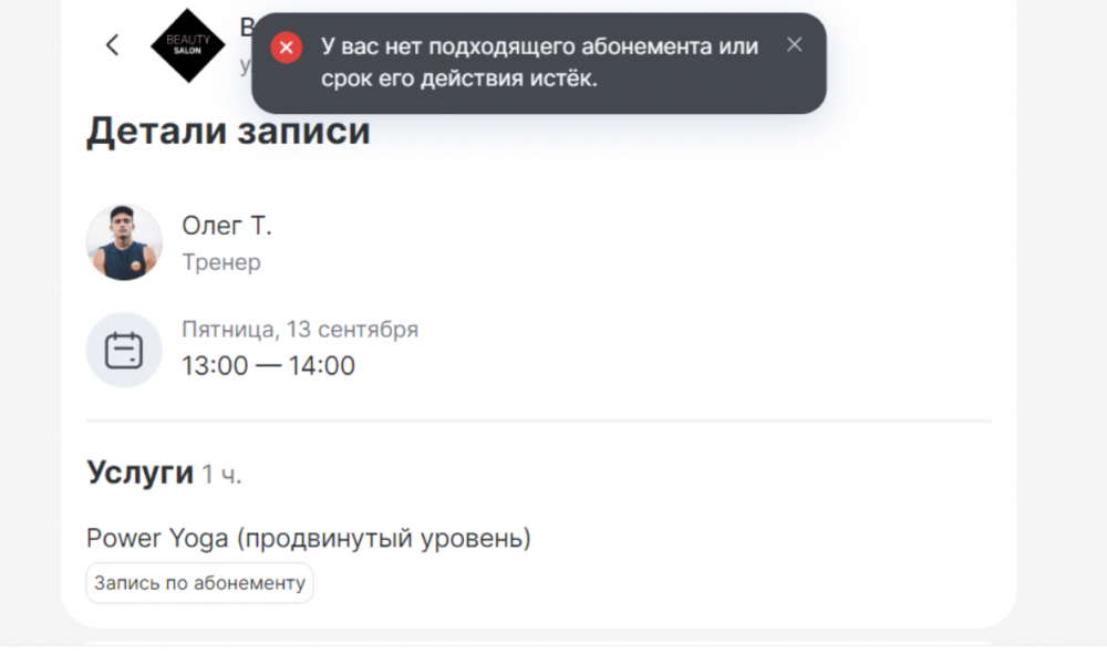 - Если клиент попробует записаться на услугу, на которую у него нет абонемента, он увидит сообщение: «У вас нет подходящего абонемента или срок его действия истек». Если у клиента есть активный абонемент на другую услугу или абонемент исчерпан/просрочен, то записаться нельзя.