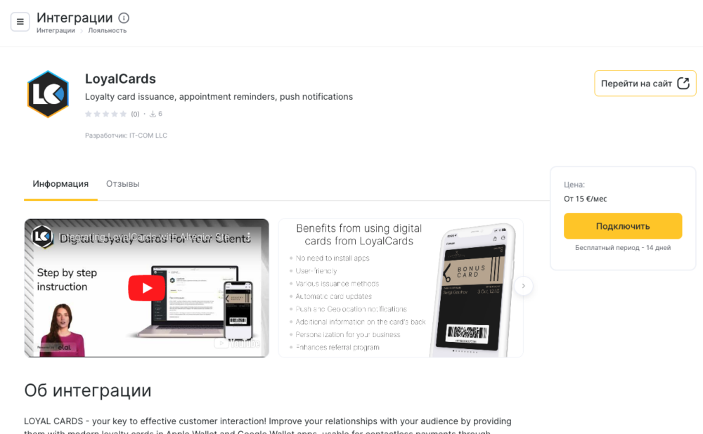 По этой ссылке вы найдете видео на Youtube, в котором раскрываются основные моменты интеграции сервиса LoyalCards и Altegio, варианты регистрации новых клиентов и выдачи карт лояльности, отправки push уведомлений, информировании клиентов о начислении и списании баллов, изменения процента начисления скидки, даты и времени времени запланированной записи.