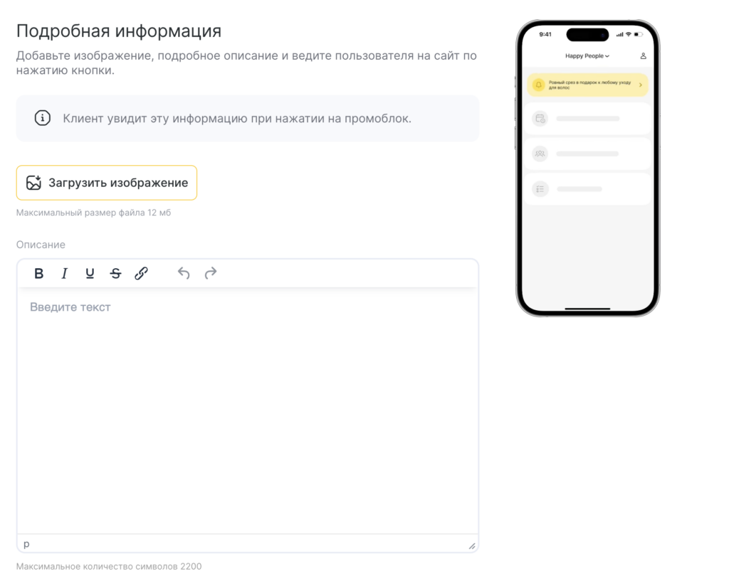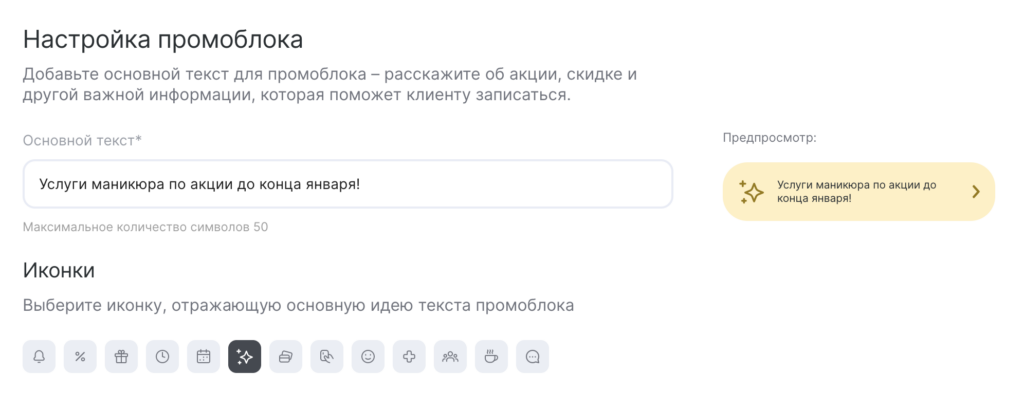 - Добавьте основной текст для промоблока — расскажите об акции, скидке и другой важной информации, которая поможет клиенту записаться. Максимальное количество символов — 50.