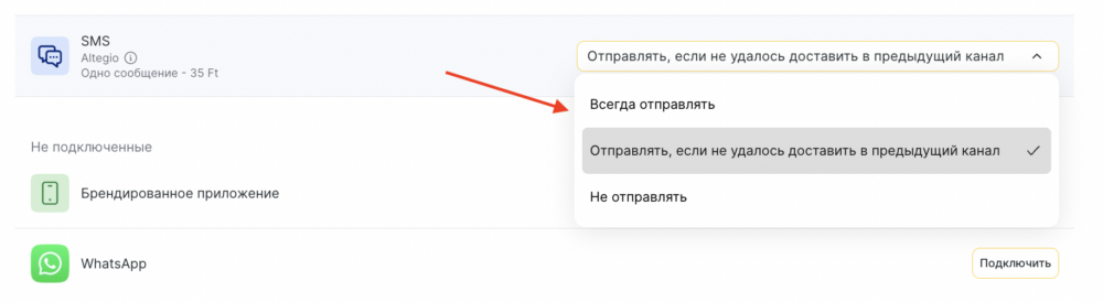 Отправлять, если не удалось доставить в предыдущий канал. Уведомление будет отправлено только в том случае, если оно не было доставлено по предыдущим настроенным каналам. Этот сценарий доступен только для каналов «Брендированное приложение» и «SMS».