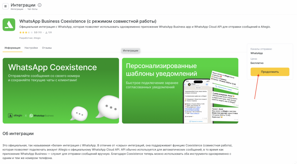 В левом меню Altegio перейдите в раздел Интеграции, выберите приложение WhatsApp Coexistance и нажмите Продолжить.