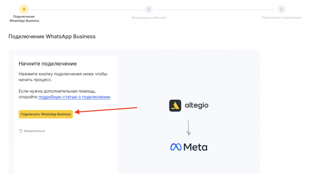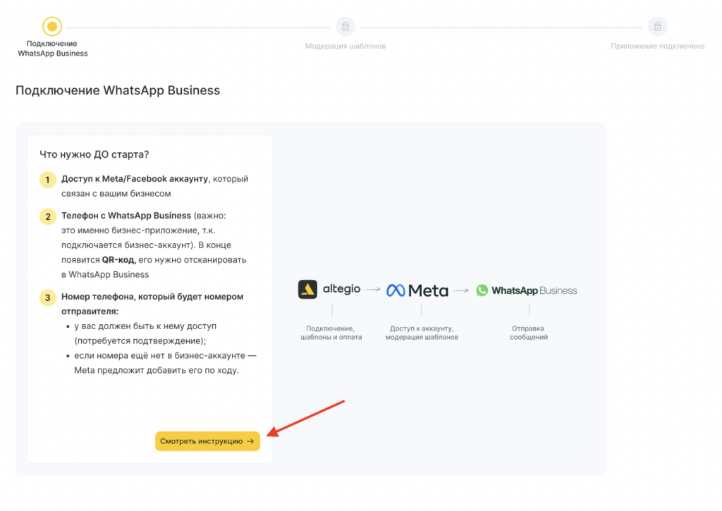 После ознакомления с инструкцией нажмите кнопку Подключить WhatsApp Business, чтобы подключить интеграцию — вы будете перенаправлены в Meta.