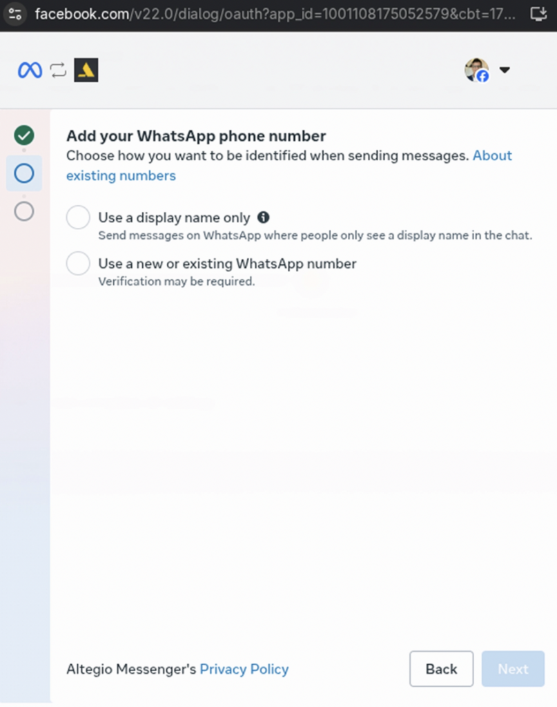 Если выбрать display-only number, Meta назначит случайный номер США (+1). Он используется только для отображения и тестирования.