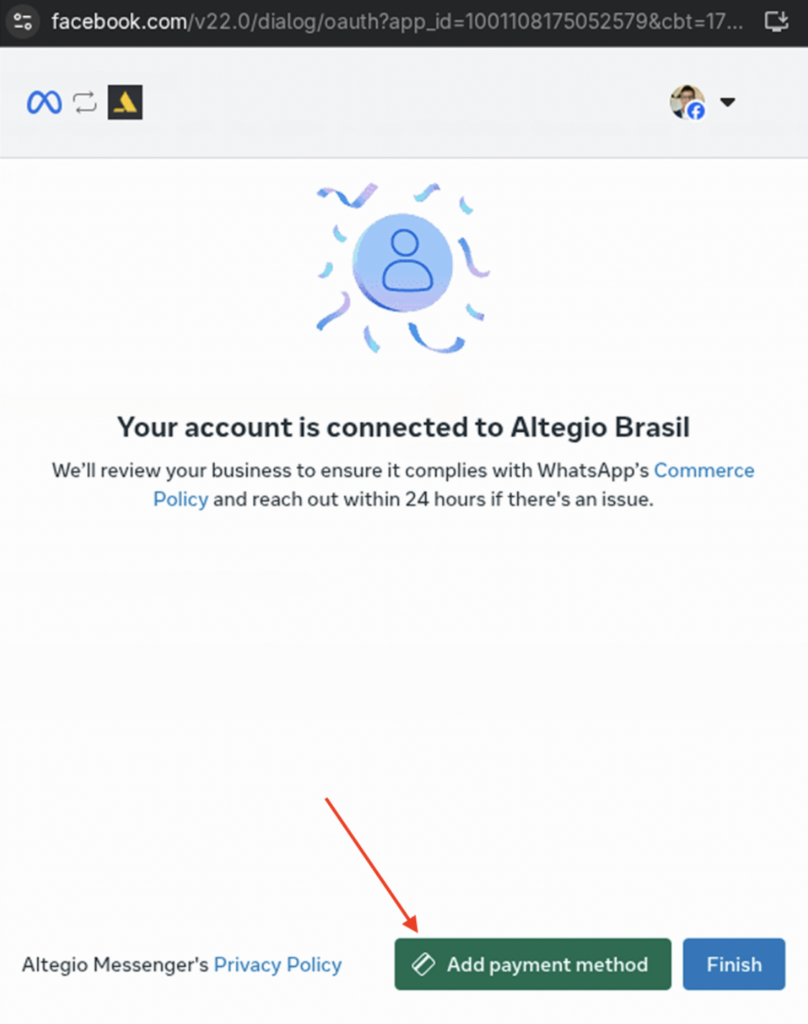 Чтобы завершить подключение, добавьте способ оплаты и привяжите банковскую карту. Это необходимо для подтверждения аккаунта и оплаты расходов WhatsApp/Meta при использовании сообщений.