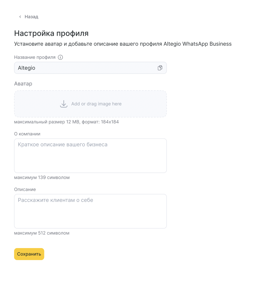 На вкладке Настройки интеграции WhatsApp Business можно указать дополнительные данные (имя и номер телефона изменить нельзя, но можно добавить текст в поля О компании и Описание, а также изображение).