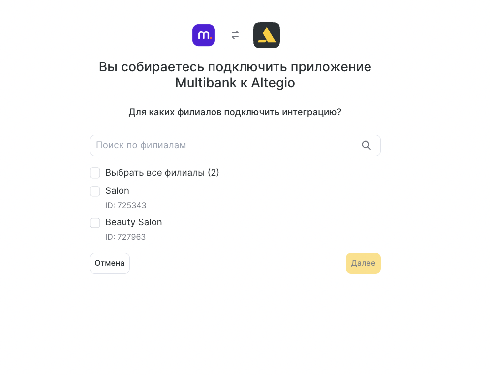 Выберите филиалы для интеграции: