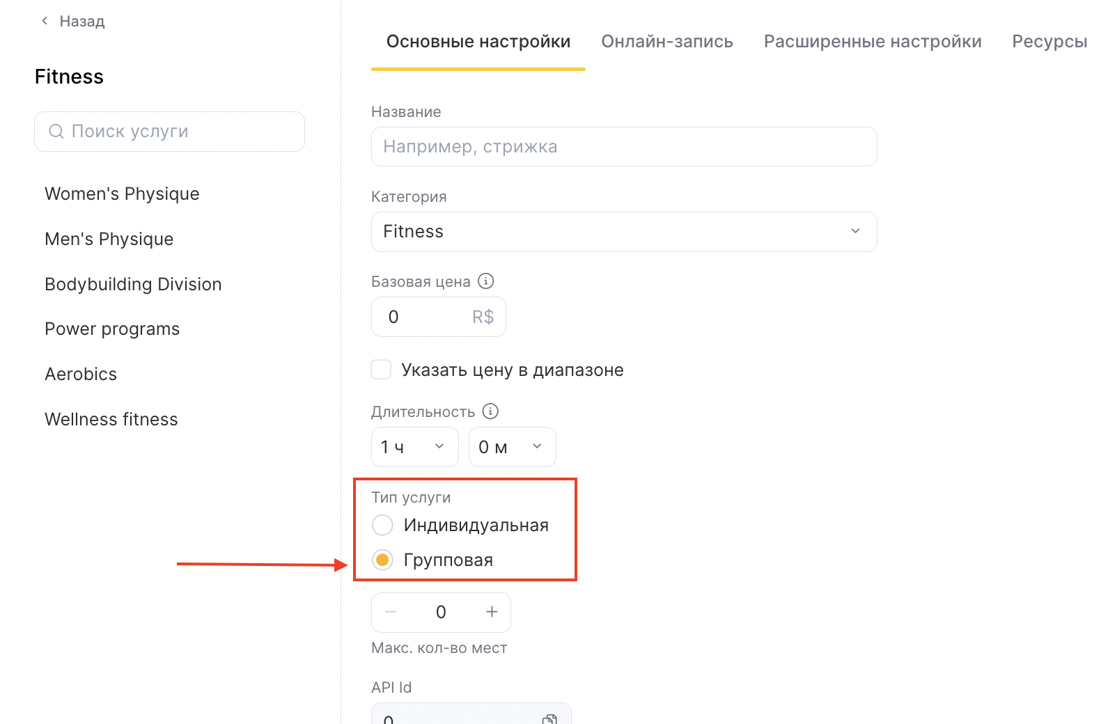 - После создания категории создайте групповую услугу. Как создать и настроить услугу подробно описано в статье. Отличие групповой от индивидуальной услуги в том, что при создании или редактировании необходимо указать ее тип «Групповая» и вместимость.