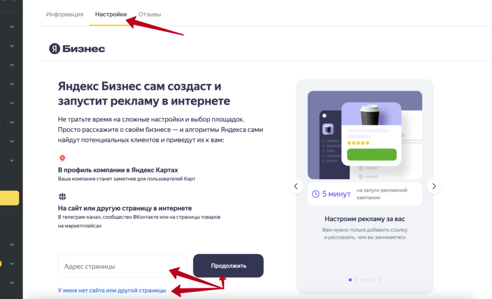 - Если у вас нет сайта или другой страницы, нажмите на соответствующую ссылку, после Яндекс Бизнес создаст бесплатный сайт для рекламы на основе информации из вашего личного кабинета.