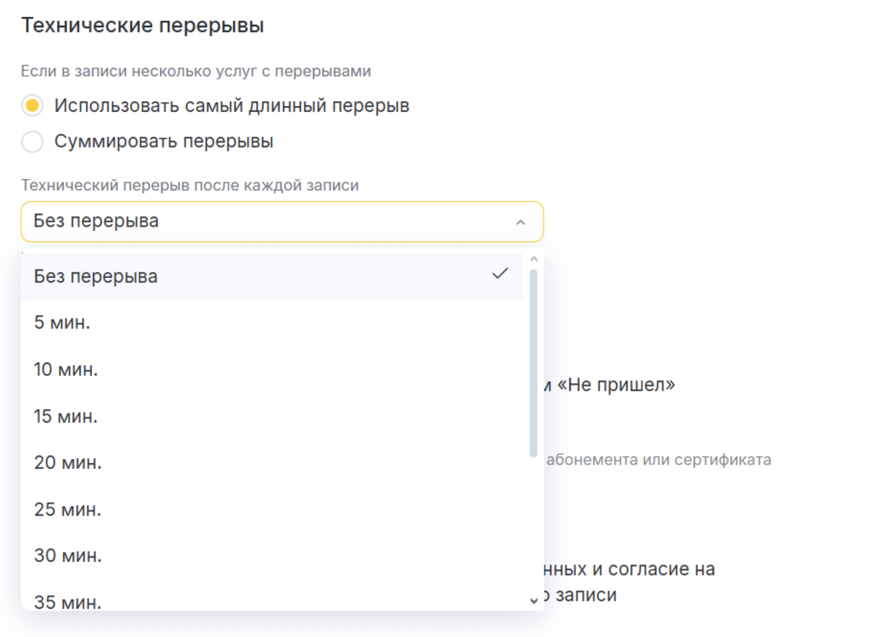 2. В блоке «Технические перерывы» выберите, как будет распределяться длительность перерывов, если в записи несколько услуг с перерывами: