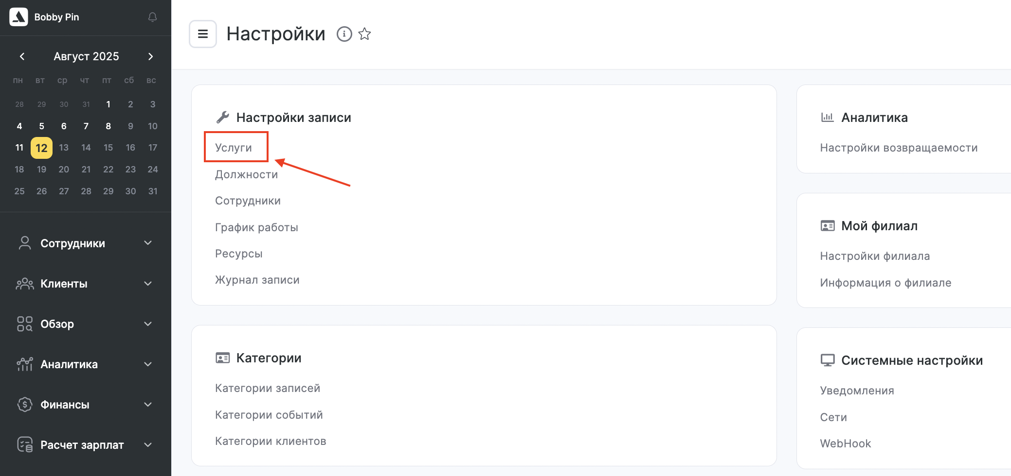 1. Перейдите в основном меню в раздел «Настройки > блок Настройки записи > Услуги».