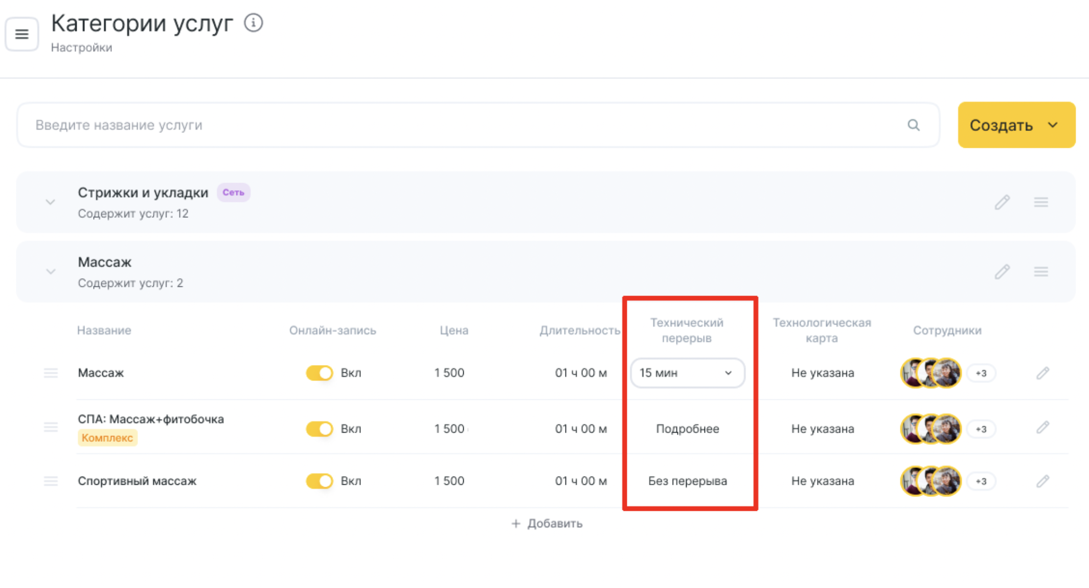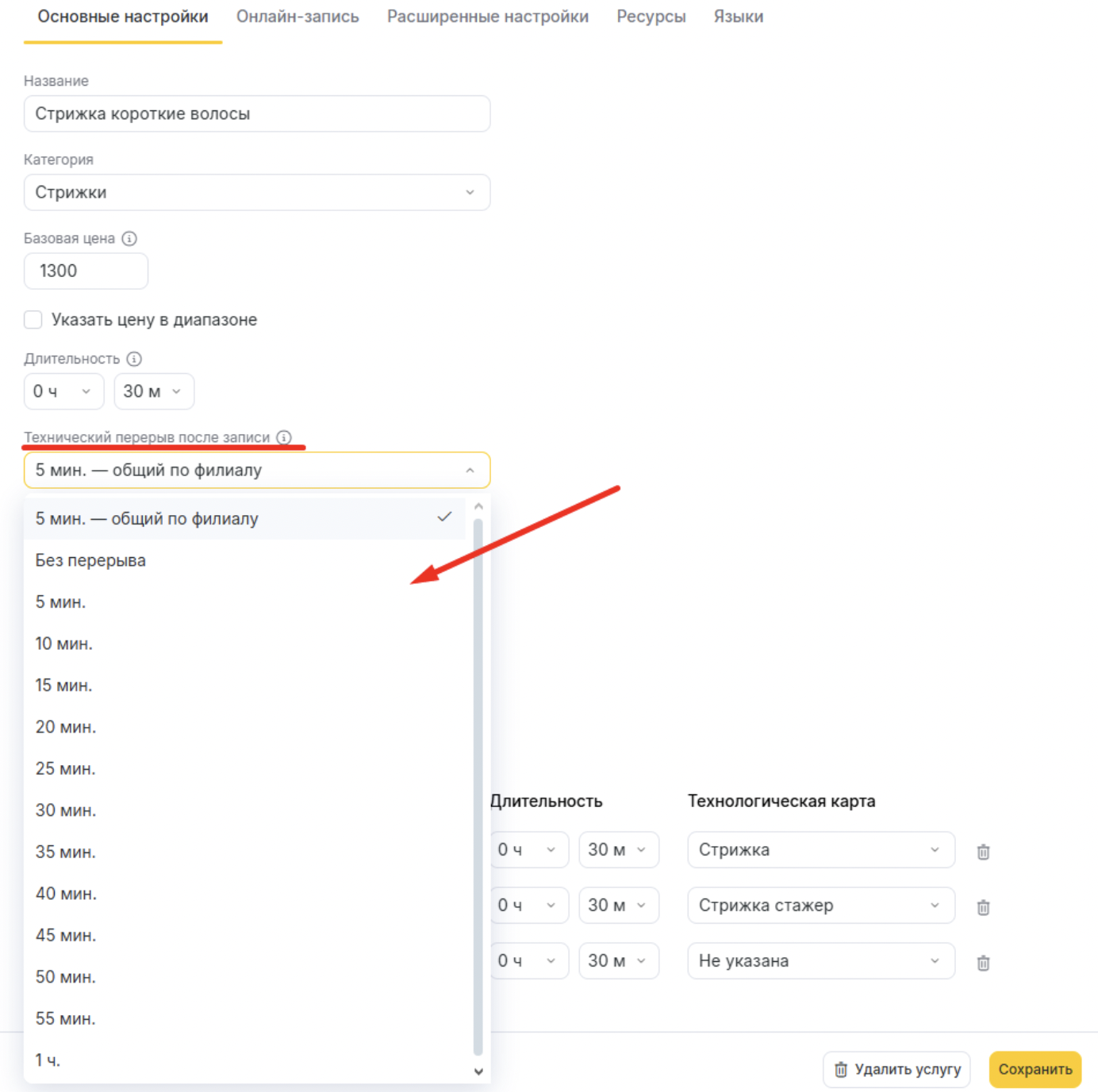 Раскройте нужную категорию с услугой. В списке услуг в блоке «Технический перерыв» выберите длительность перерыва — от 0 (без перерыва) до 1 часа с интервалом в 5 минут. После выбора настройка сразу сохранится.