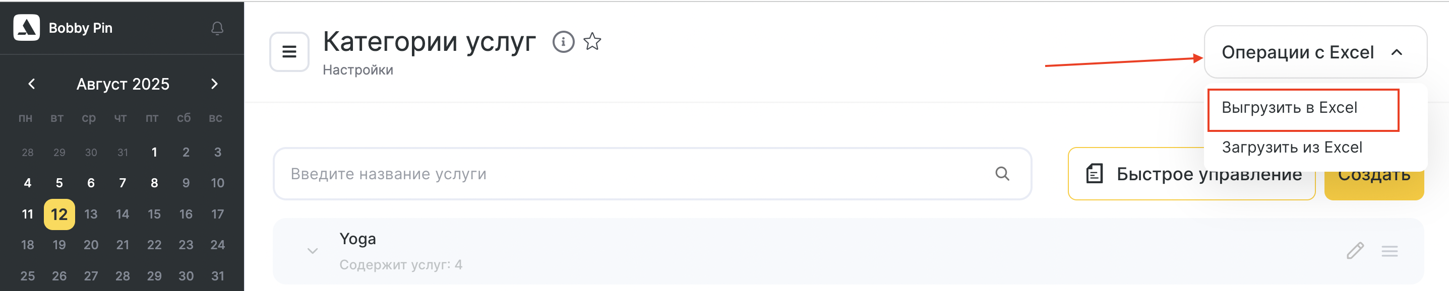 Выгрузите услуги в Excel через кнопку «Операции с Excel» → «Выгрузить в Excel».
