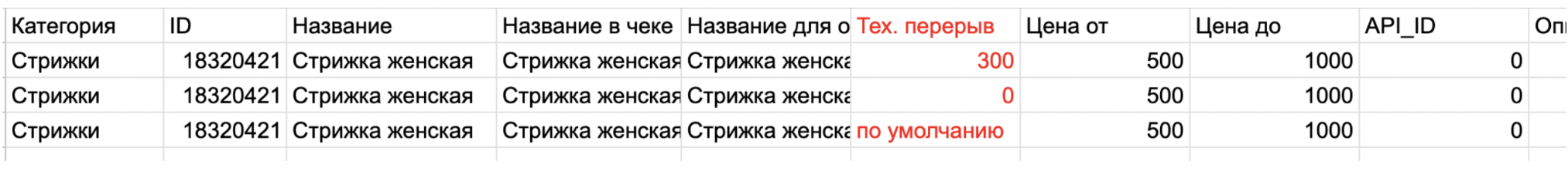 - Длительность услуги «Стрижка» 1 час + для нее включен тех. перерыв 30 минут.