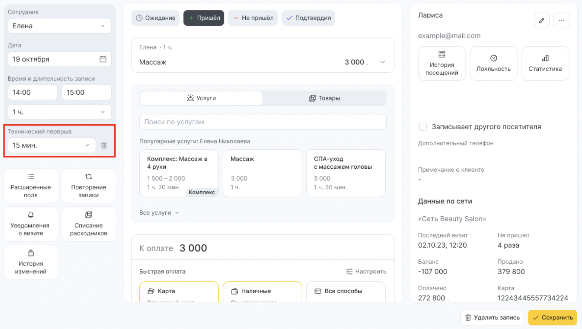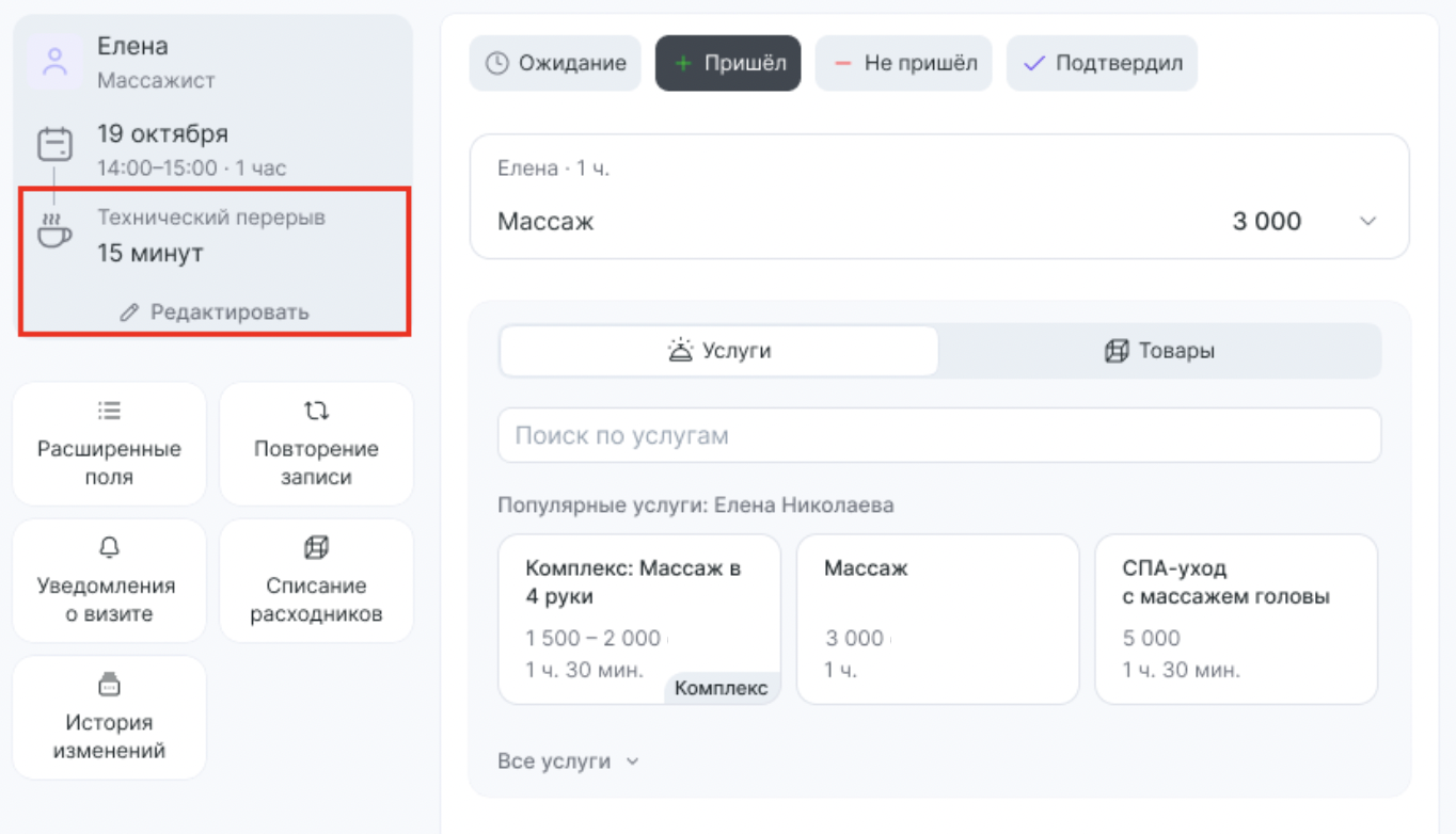 Если технический перерыв уже добавлен в запись, его можно отредактировать или удалить в окне записи через кнопку «Редактировать».