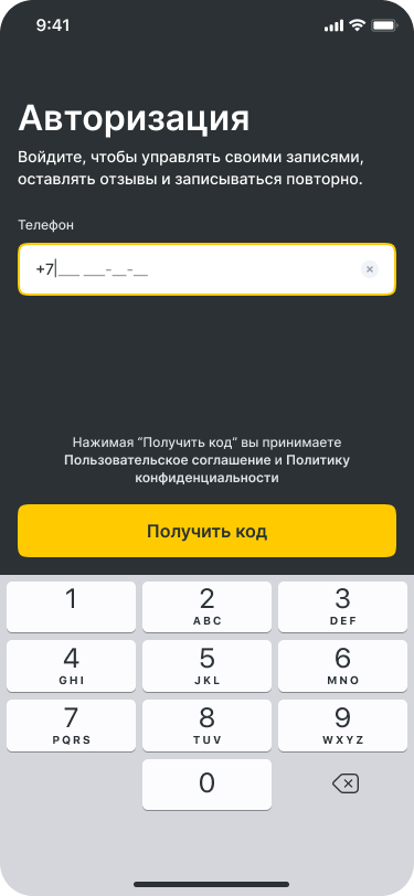 Далее необходимо авторизоваться под тем же номером телефона, на который клиент ранее записывался через Altegio.