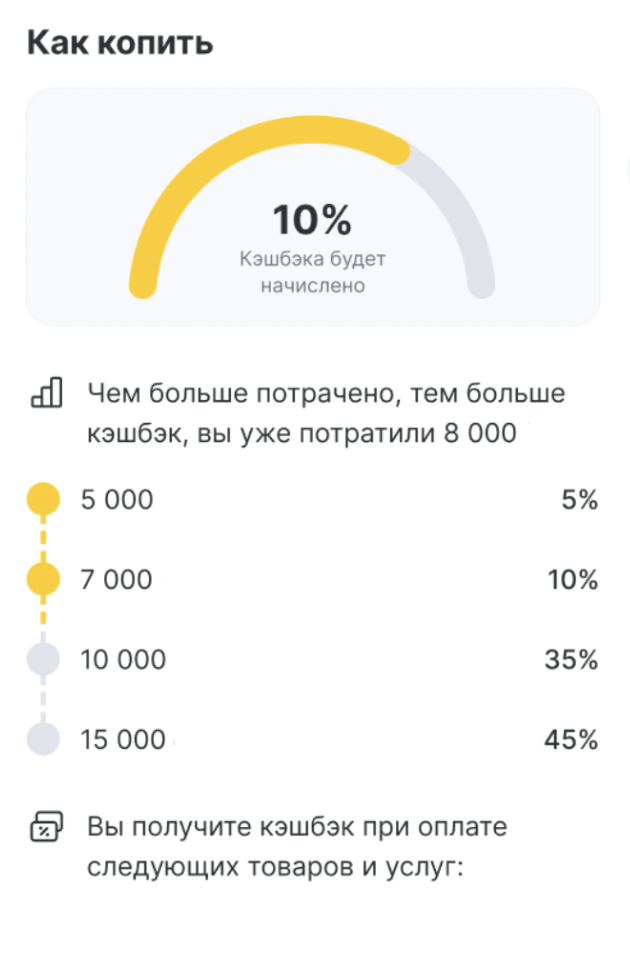 - Накопительные бонусы от суммы — текущий размер кэшбэка (% или сумма) и сколько осталось потратить до перехода на следующий уровень получения кэшбэка.
