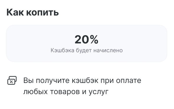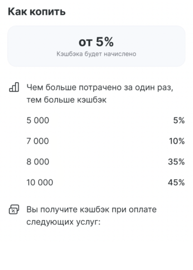 В блоке Как копить отображается информация с условиями начисления кэшбэка.