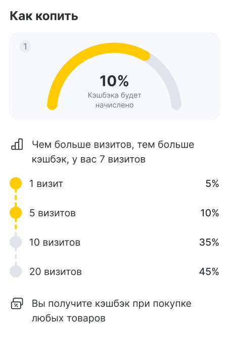 - Накопительные бонусы от количества визитов — текущий размер кэшбэка (% или сумма) и сколько визитов осталось до перехода на следующий уровень получения кэшбэка.