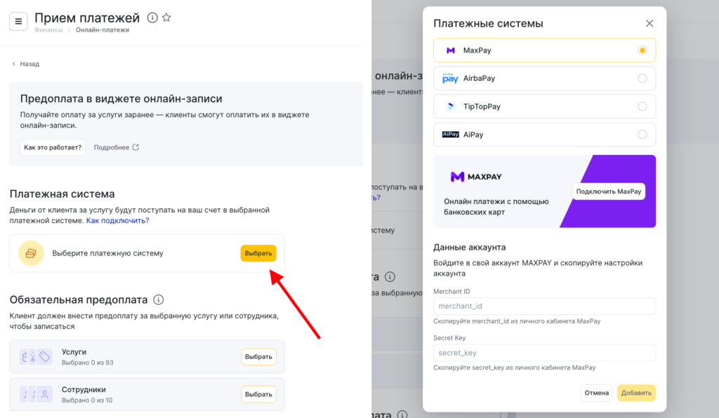 Онлайн-предоплата в настройках услуг или сотрудников #