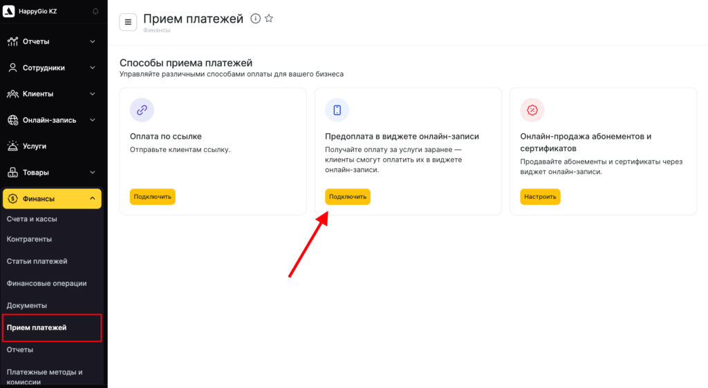 - В режиме Администрирование перейдите в раздел Финансы > Прием платежей и нажмите кнопку Подключить в блоке Предоплата в виджете онлайн-записи.
