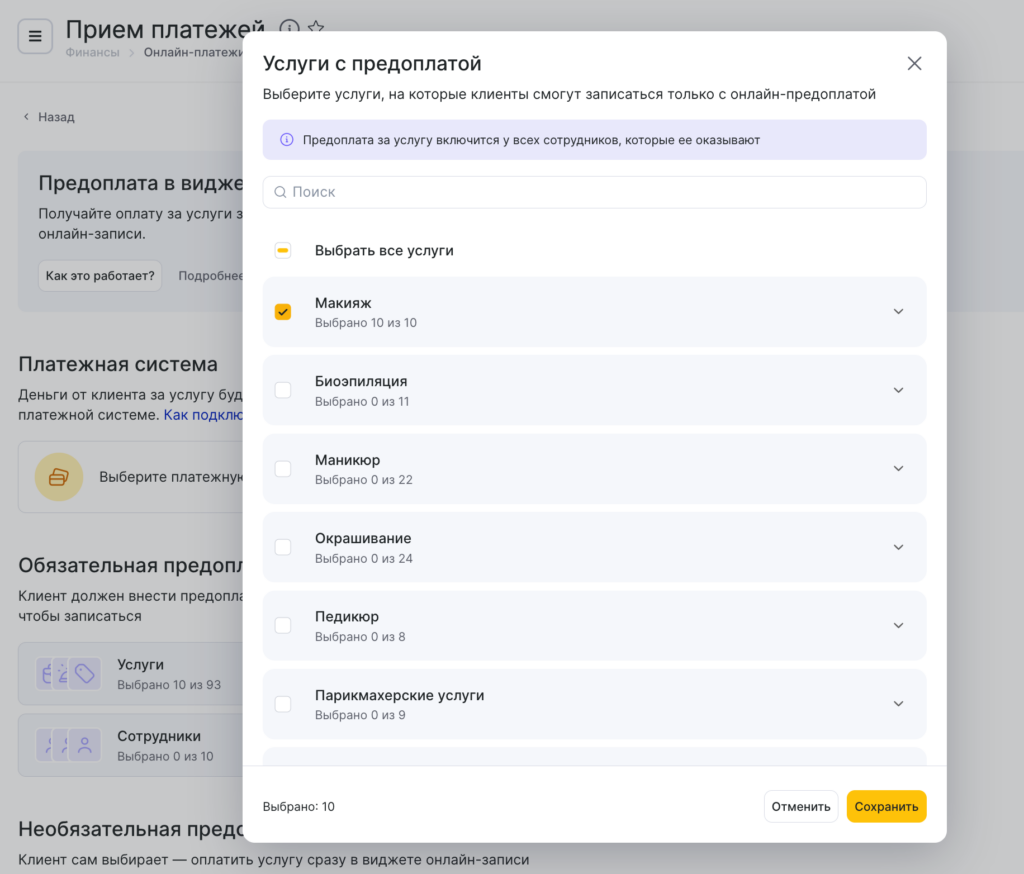 - Раскройте нужную категорию и отметьте галочками услуги, для которых будет включена онлайн-предоплата. Если услуг много, вы можете воспользоваться строкой поиска.