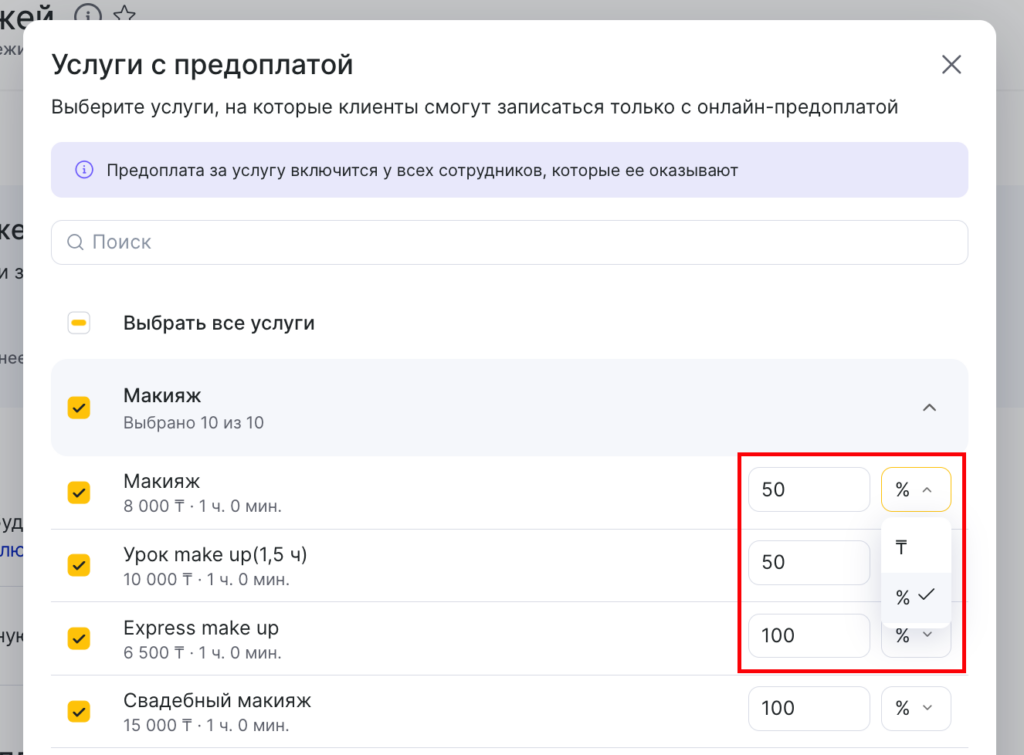 - Для индивидуальных услуг можно настроить частичную предоплату, для сотрудников можно настроить только полную предоплату — 100%.