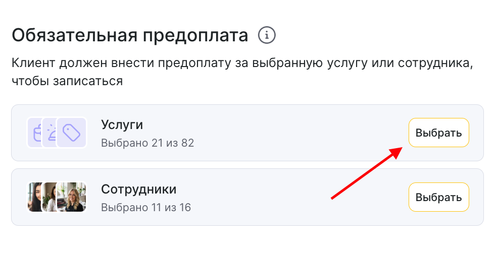 - В блоке Обязательная предоплата нажмите на кнопку Выбрать напротив блока с услугами.