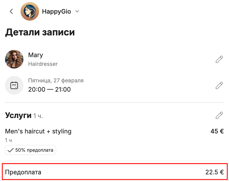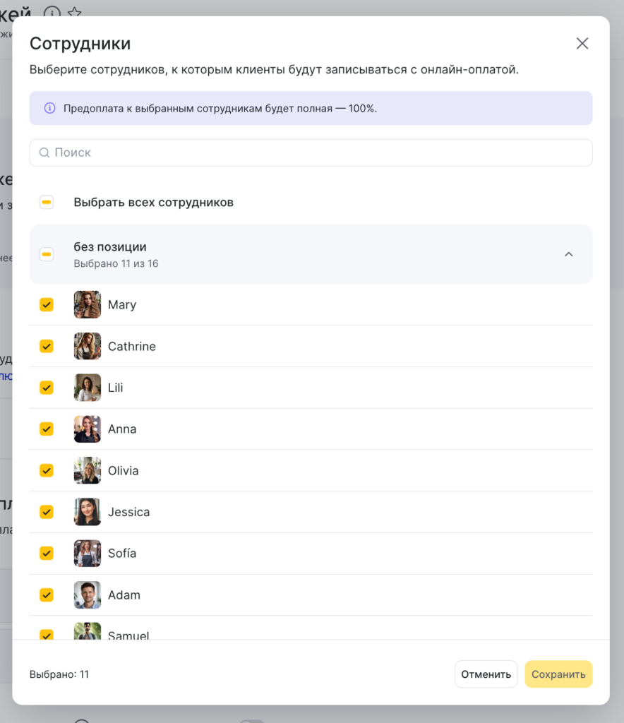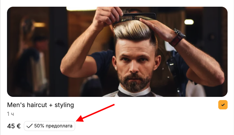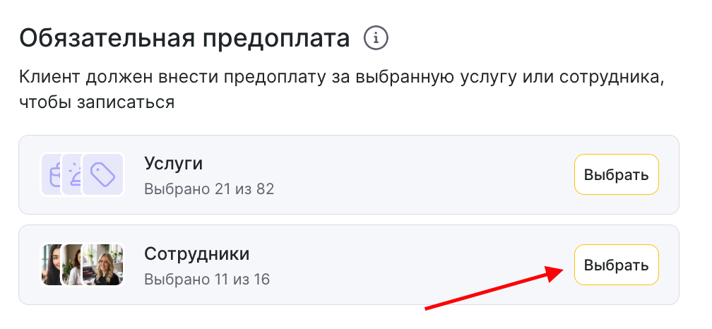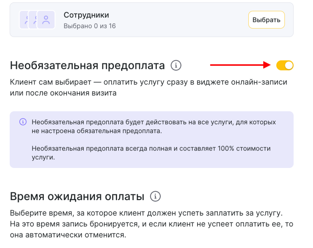 Вы можете настроить онлайн-предоплату для выбранных вами услуг и/или сотрудников.
