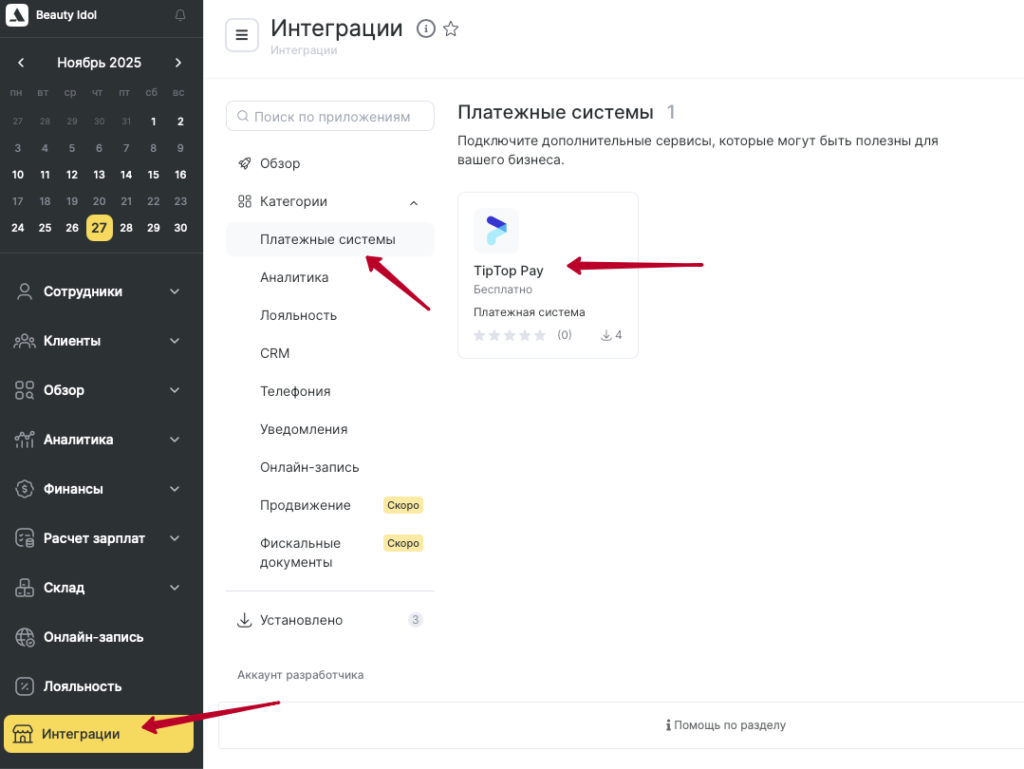 Левая панель → Интеграции → Маркетплейс → Платежные системы → TipTop Pay