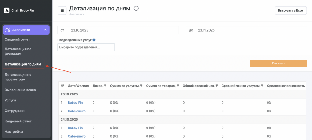Отчeт «Детализация по дням» позволяет просматривать ключевые показатели по каждому филиалу с разбивкой на дни. Это удобный инструмент для анализа динамики в разрезе дат: как меняется выручка, загрузка, средний чек и клиентский поток по дням, а также сравнение филиалов между собой внутри конкретного дня.