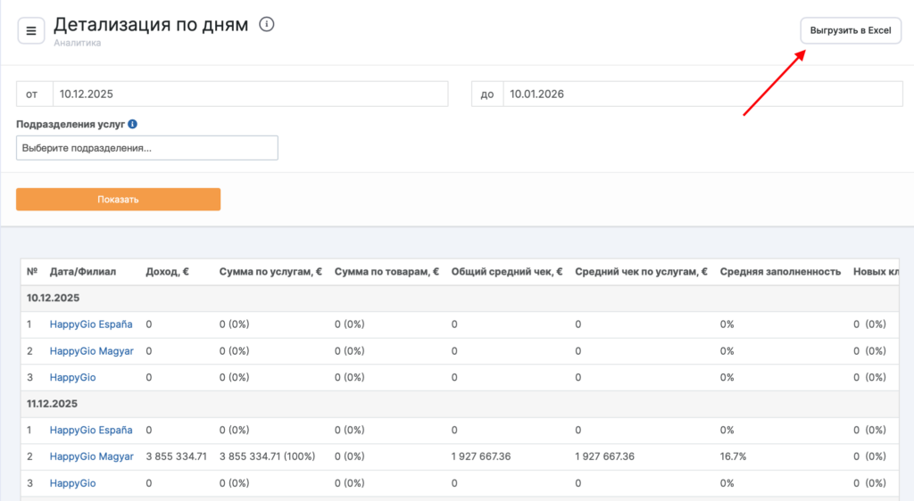 Отчeт Детализация по дням позволяет просматривать ключевые показатели по каждому филиалу с разбивкой на дни. Это удобный инструмент для анализа динамики в разрезе дат: как меняется выручка, загрузка, средний чек и клиентский поток по дням, а также сравнение филиалов между собой внутри конкретного дня.