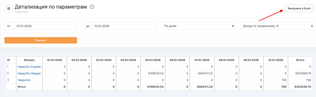 Отчет Детализация по параметрам позволяет проанализировать любой отдельный показатель по всем филиалам в динамике — с разбивкой по дням выбранного периода.