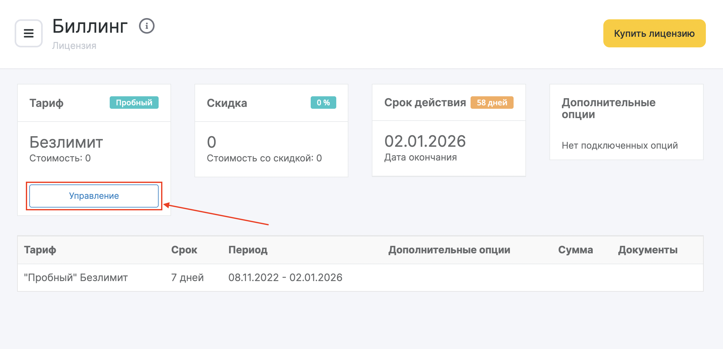 1. Перейдите в основном меню в раздел Биллинг > Лицензия и нажмите на кнопку «Управление» в блоке «Тариф».