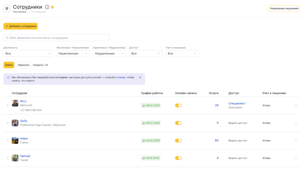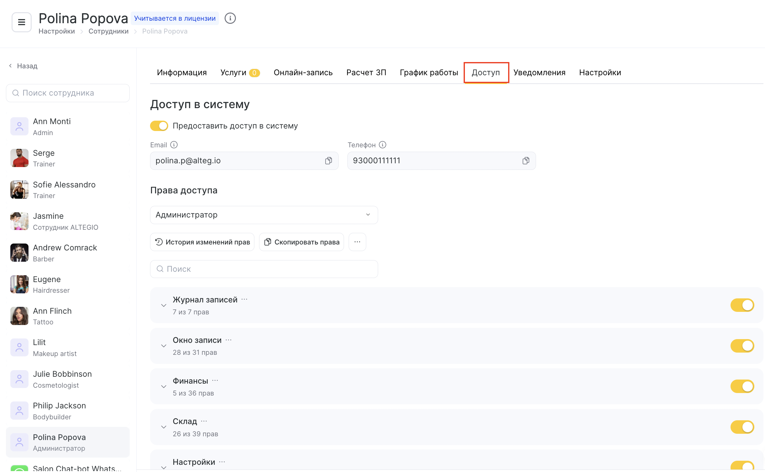 - Доступ в Altegio — сотрудник сможет входить в систему и пользоваться сервисом согласно назначенным правам доступа.