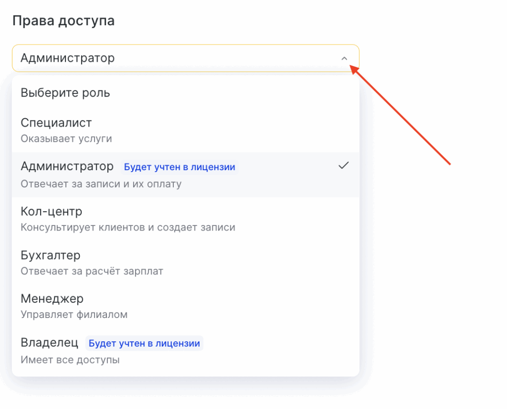 В поле «Права доступа» выберите подходящую роль из выпадающего списка: