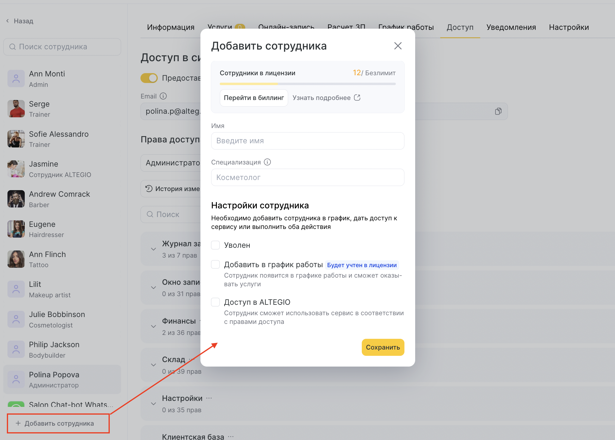 - Добавить в график работы — сотрудник появится в графике и сможет оказывать услуги. Эта опция учитывается в лицензии.