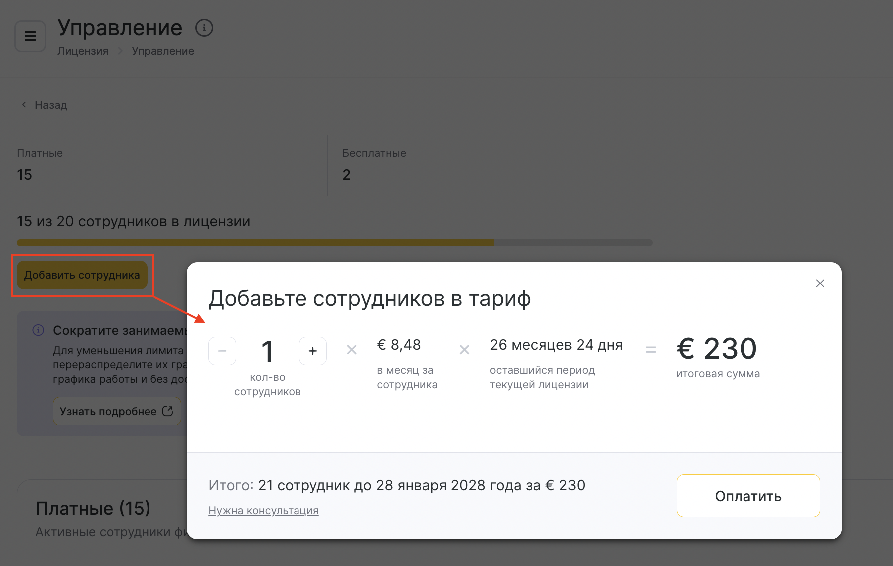 Чтобы увеличить тарифный план, перейдите в раздел управления лицензией и нажмите «Добавить сотрудника».