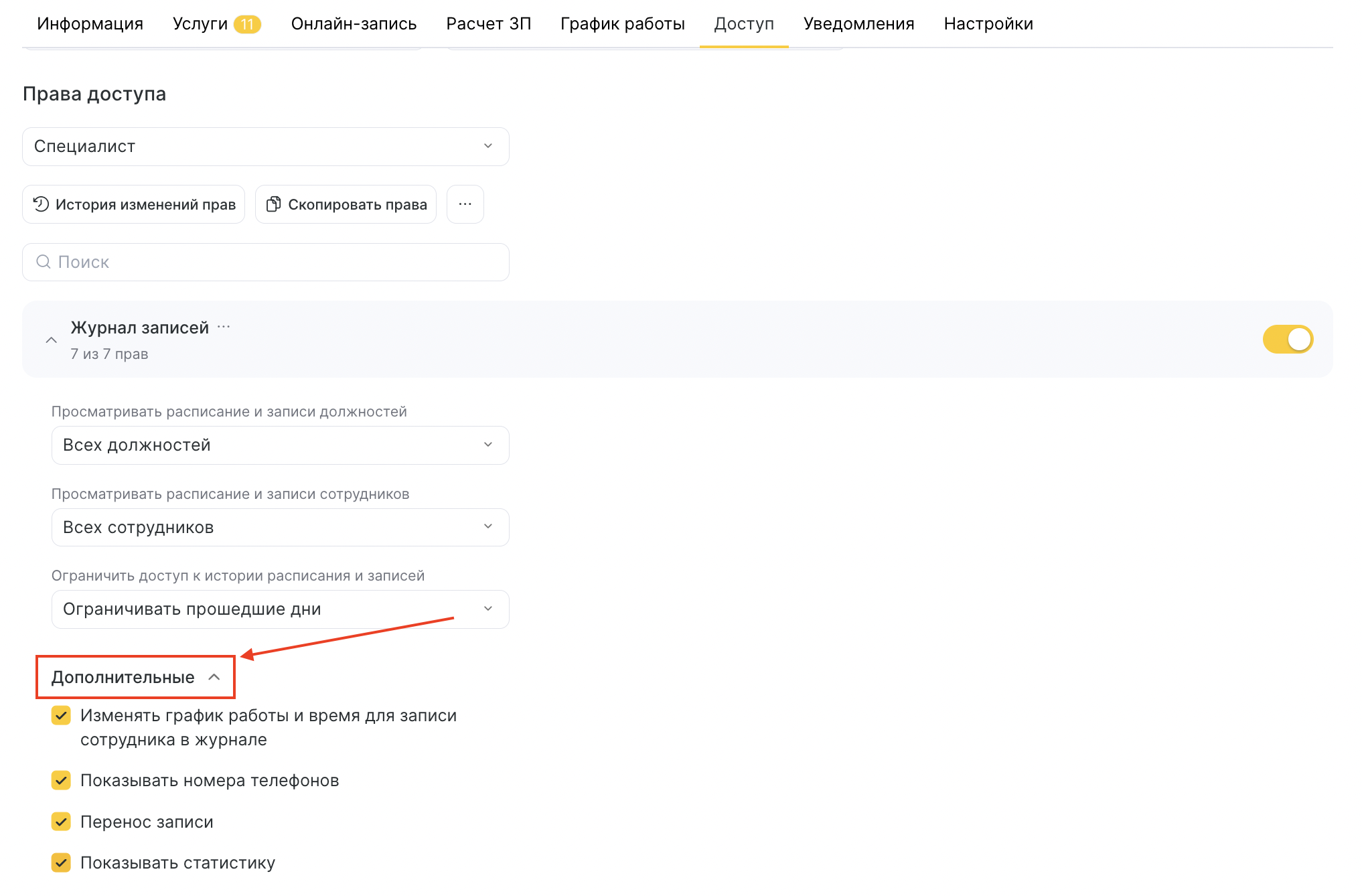 5. Чтобы добавить дополнительные права доступа, нажмите на стрелку справа от переключателя и затем на строку «Дополнительные». В раскрывшемся списке выберите необходимые параметры или поставьте галочки.