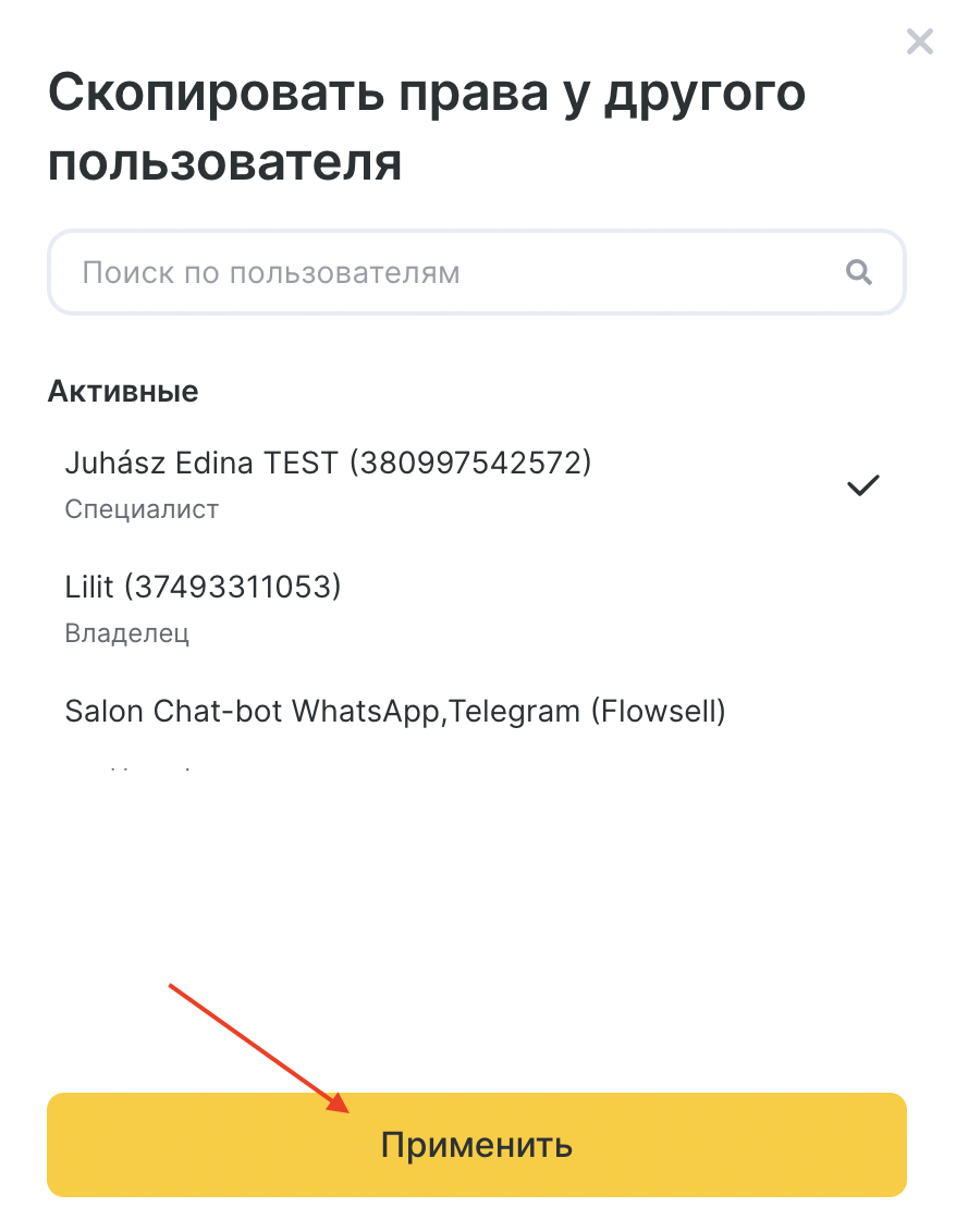 4. Выберите сотрудника из списка, права которого необходимо скопировать, можно воспользоваться поиском по сотрудникам. Нажмите кнопку «Применить».