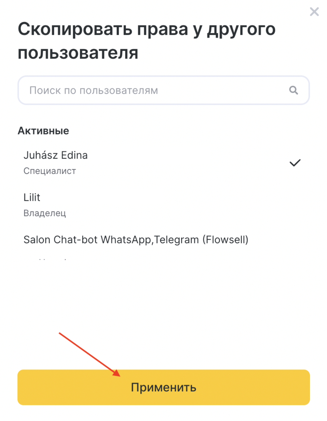 - Выберите сотрудника из списка, права которого необходимо скопировать, можно воспользоваться поиском по сотрудникам. Нажмите кнопку Применить.