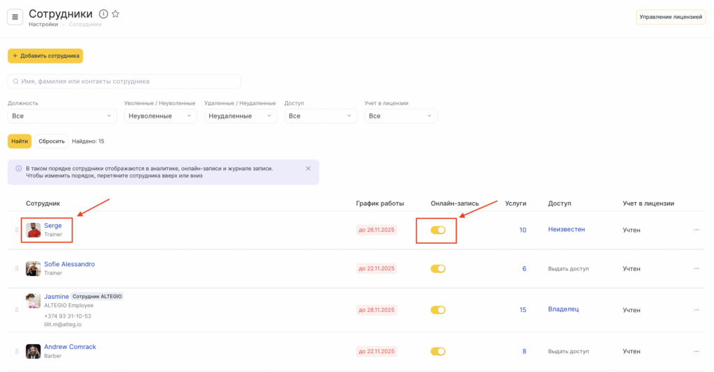 - Перейдите в раздел Настройки > блок Настройки записи > Сотрудники. На странице управления списком сотрудников вы можете быстро включать и выключать онлайн-запись для сотрудника без перехода в его настройки.