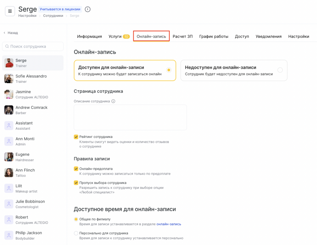 После назначения сотруднику услуг, настройте для него онлайн-запись. Вы можете настроить доступность для онлайн-записи, описание, отображение рейтинга, онлайн-предоплату, пропуск выбора сотрудника, а также время для записи.