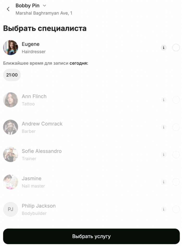 Пропуск выбора сотрудника — поставьте галочку, чтобы разрешить запись к сотруднику при выборе опции клиентом Любой специалист. Включение пропуска выбора в настройках сотрудника позволяет клиентам выбирать любого из сотрудников, если для них настроена эта опция, а также если включен сам выбор любого сотрудника.