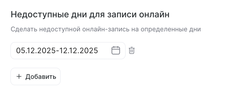 Вы можете сделать недоступной онлайн-запись к сотруднику на определенные дни и/или периоды. Например, если в конкретные дни сотрудник принимает клиентов офлайн. Это поможет в предпраздничные дни, чтобы контролировать запись и записывать клиентов самостоятельно.