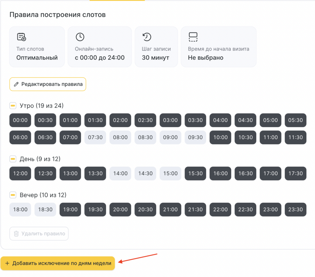- Отредактируйте доступность слотов на утро/день/вечер при необходимости. Эта настройка доступна только для фиксированного и оптимального типа слотов с опцией От времени онлайн-записи. Для этого нажмите на нужные слоты: