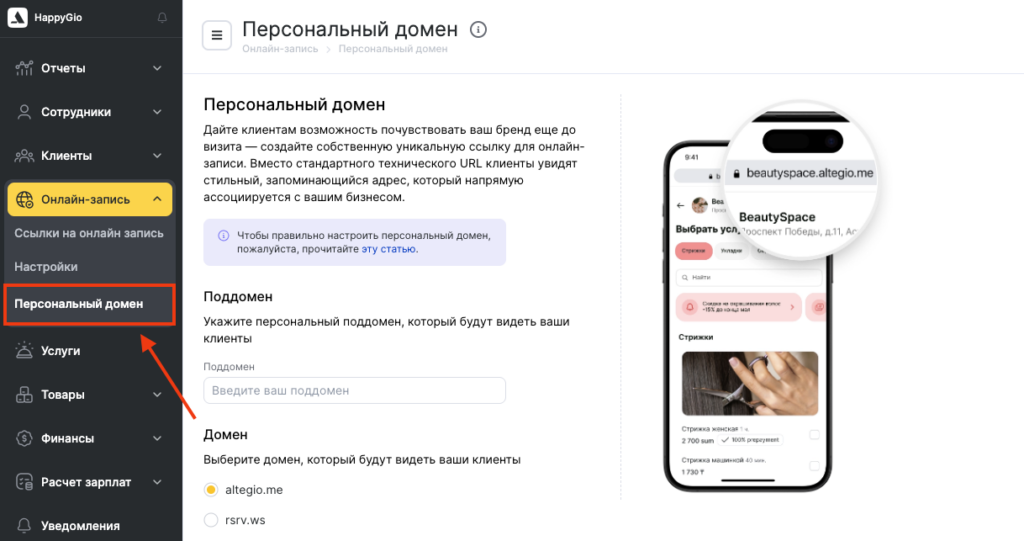 Персональный домен позволяет создать короткую брендированную ссылку для онлайн-записи, которая выглядит профессионально и легко запоминается клиентами. Вместо стандартного технического URL вы можете использовать адрес, связанный с вашим бизнесом.