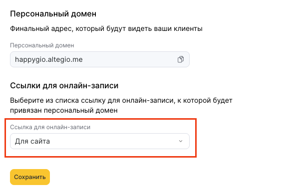 В разделе Ссылки для онлайн-записи выберите, к какой ссылке будет привязан персональный домен.