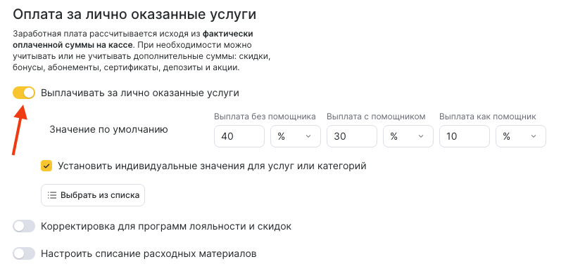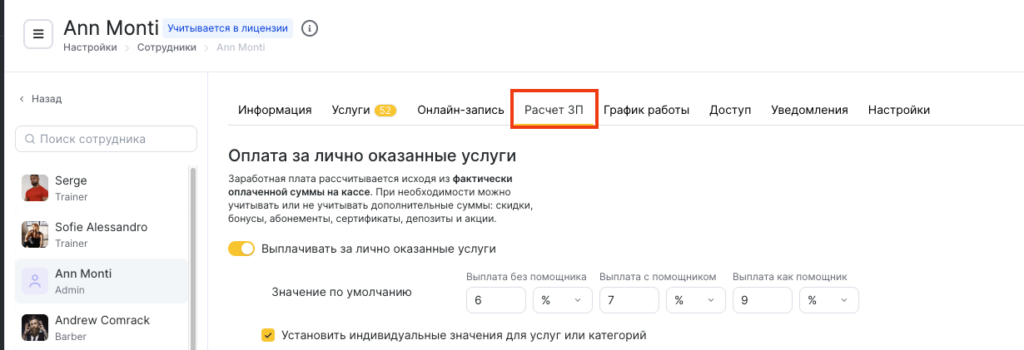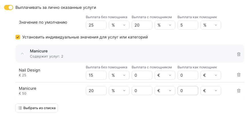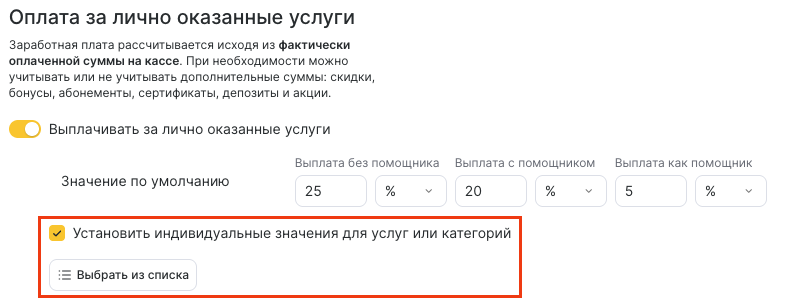 - Если за выполнение отдельных услуг сотруднику нужно назначить иной процент, включите опцию Установить индивидуальные значения для услуг или категорий.