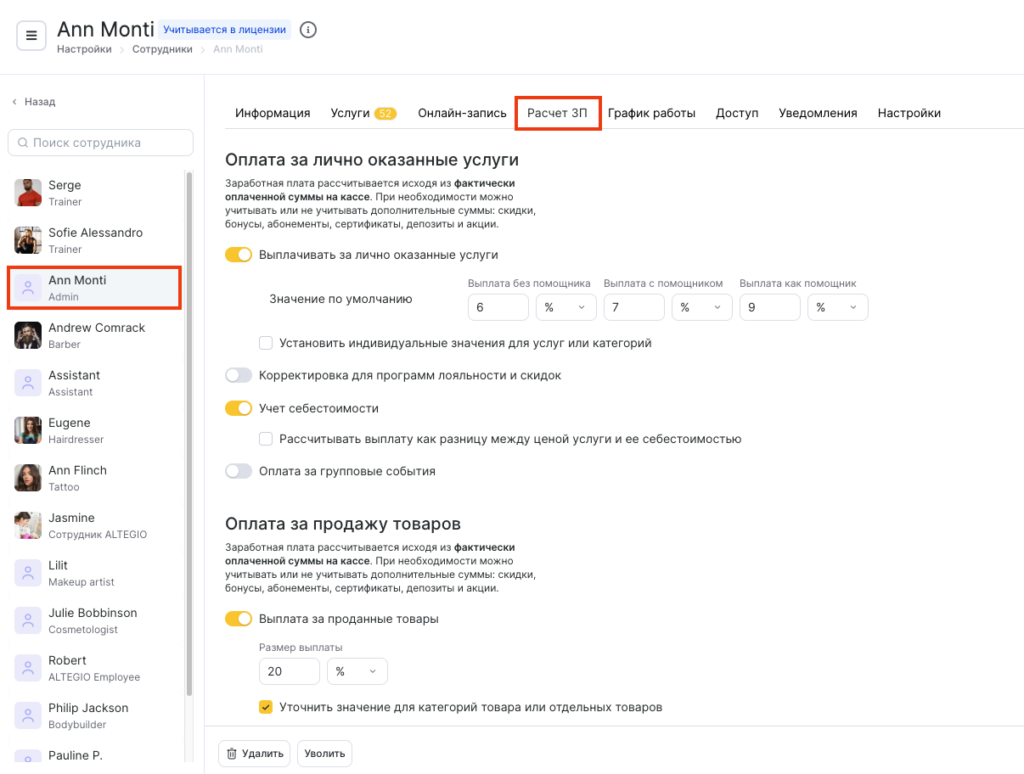 В этом разделе настройте, как сотрудник будет получать оплату за услуги, которые он выполнил лично или в которых участвовал как ассистент. Заработная плата рассчитывается исходя из фактической суммы, оплаченной клиентом на кассе. Вы можете выбрать, учитывать ли дополнительные суммы (такие как скидки, бонусы, абонементы, подарочные карты, счета клиента или акции).